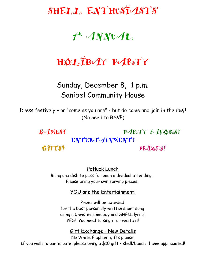 Are you still looking for your ugliest or prettiest holiday sweater, socks, hat, or tie? Have you composed funny shell lyrics to sing to a favorite holiday song? Did you find the perfect shell-themed gift ($10 or less) for the gift exchange? If yes to all the above, you are ready for the Annual Shell Enthusiasts’ Holiday Party!