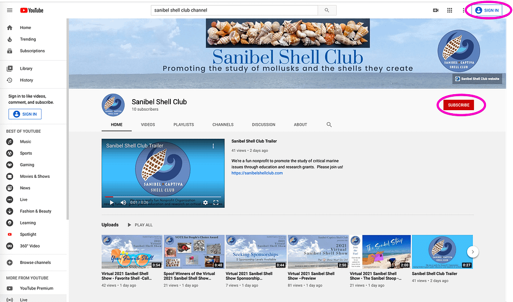Here’s a view of what our Shell Club YouTube Channel home page looks like. If you already have a YouTube account, click SIGN IN in upper right and also click SUBSCRIBE to our channel. Then start watching our fun videos.