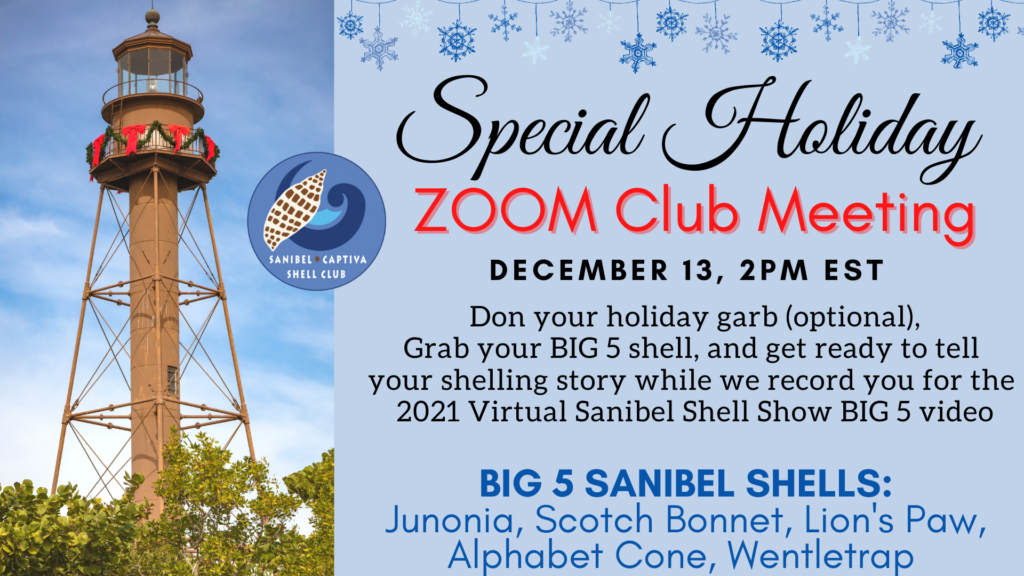 SURPRISE!! Since we can’t have our usual Club holiday get together, we have decided to have a special December Shell Club meeting (party!) via Zoom on Sunday, the 13th at 2:00 PM EST. And yes, you may wear your best or worst holiday attire!