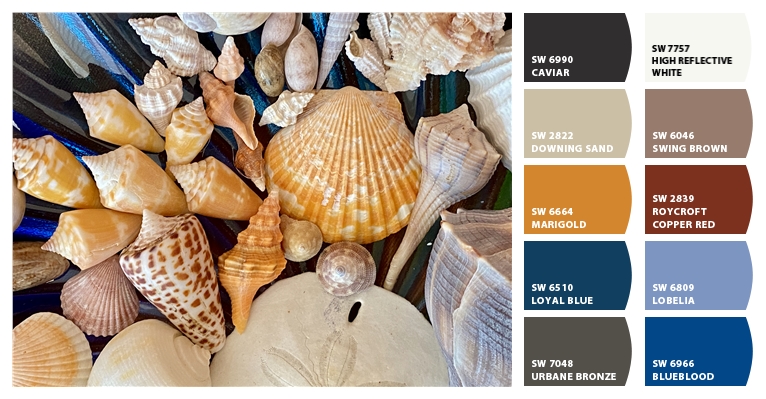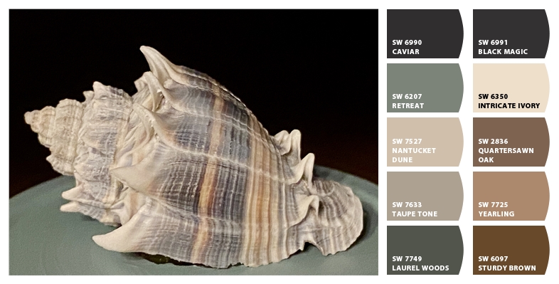 With so many choices in just this one photo, you’ve saved yourself a lot of time browsing 10,000 paint chips at the store. And it’s interesting to read the names of these paint colors. Caviar? Blueblood? Marigold is a great name for the color of both the baby Horse Conch and the Atlantic Calico Scallop.