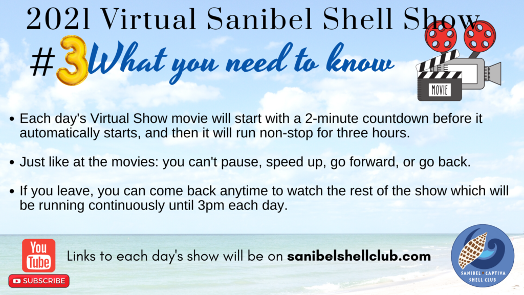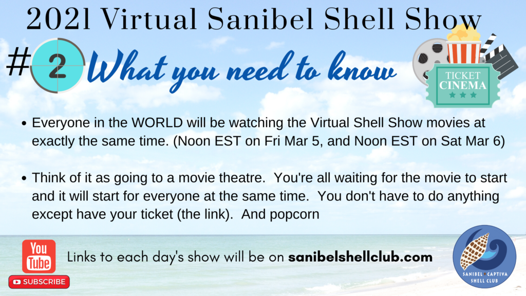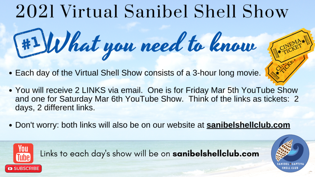 We’re not quite ready to publish the list of videos that will be in the Virtual Shell Show or the links to take you straight to the videos, but here is some information to help you understand how the 2021 Virtual Sanibel Shell Show is going to work. Remember, the Virtual Shell Show is March 5+6 from noon to 3pm EST and it is FREE on YouTube.