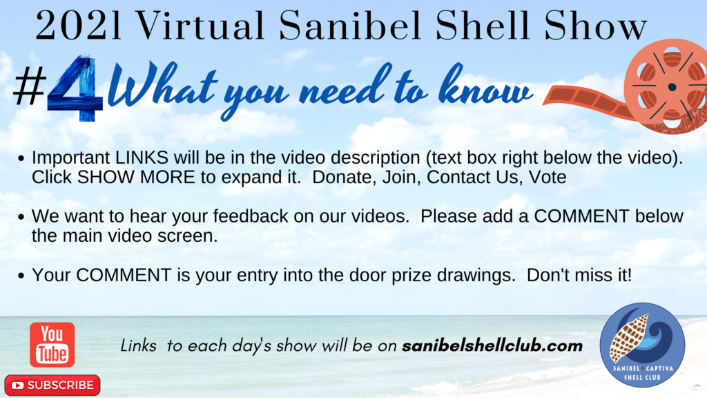 The best way to get the list of videos and the links to the two Virtual Shell Show movies is through our membership email blast. All active members of the Sanibel-Captiva Shell Club will receive an email with the links for each day along with any special instructions and announcements. Not a member? Now’s the perfect time to join so you don’t miss a thing! Click HERE to join online. Links will also be on our website and social media.