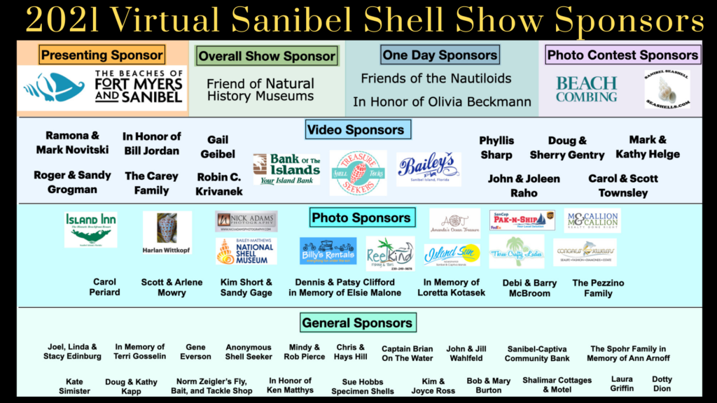 Click here to see our generous SPONSORS. Thank you for your tremendous support and loyalty for the Sanibel Shell Show and Shell Club. We are grateful.