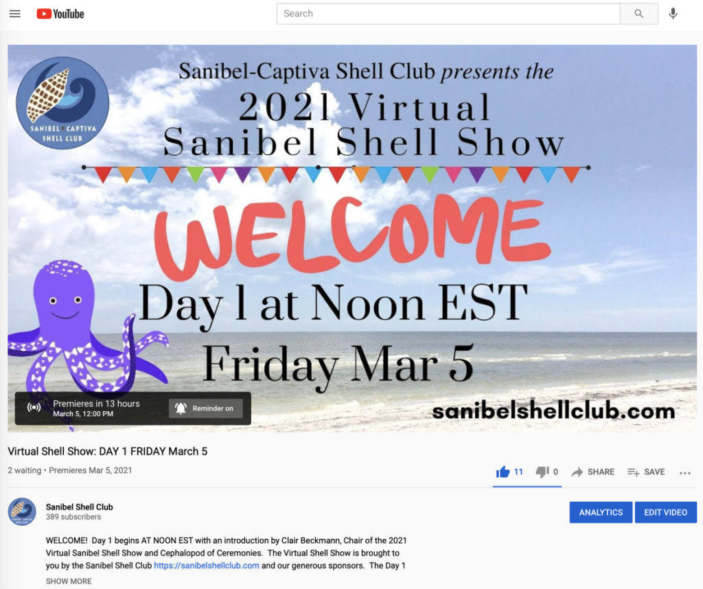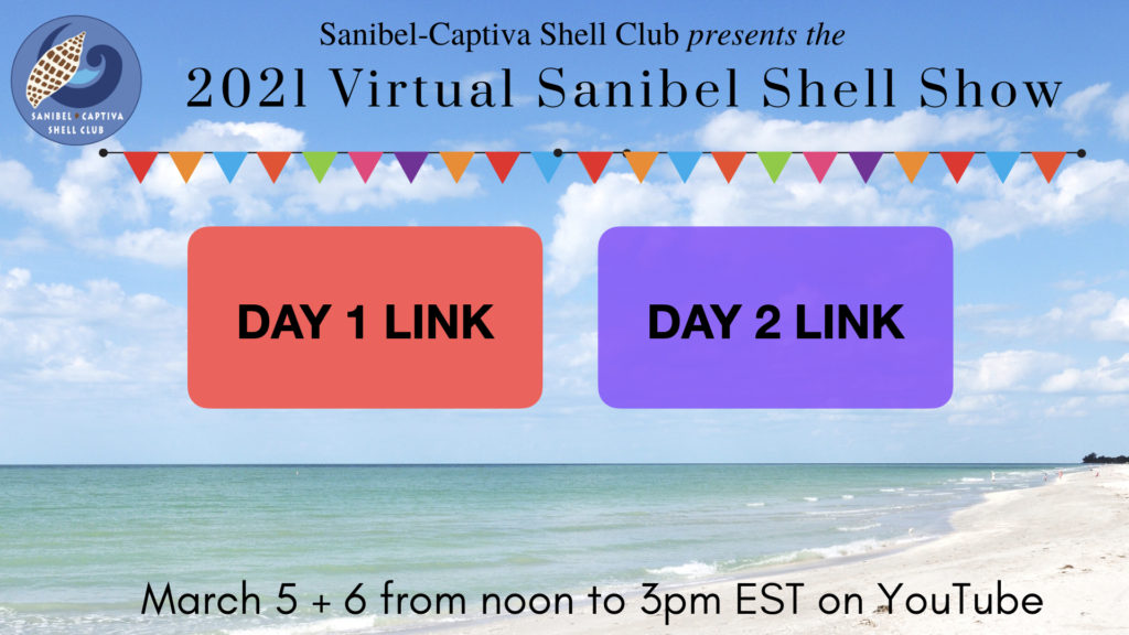Here are the direct LINKS to each day’s Virtual Sanibel Shell Show on our club’s YouTube channel. The 2-day show will automatically begin at noon EST on Friday Mar 5 and at noon EST on Saturday Mar 6.
