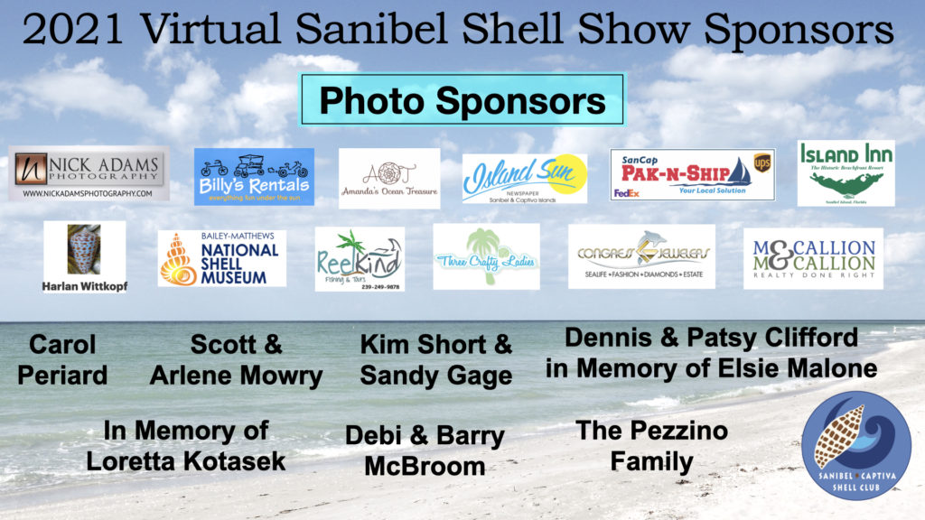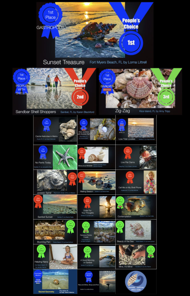The sweeping success of the 2021 Virtual Sanibel Shell Show was due in part to the impressive number of participants in the Shell Photo Contest by our club members and the public, and to those voting for People’s Choice photo award. Including those photos submitted for the Sanibel Stoop and Your Favorite Shell slideshows, we received 424 photos from 15 countries! Thank you all for contributing to make our Virtual Shell Show so fun and successful.