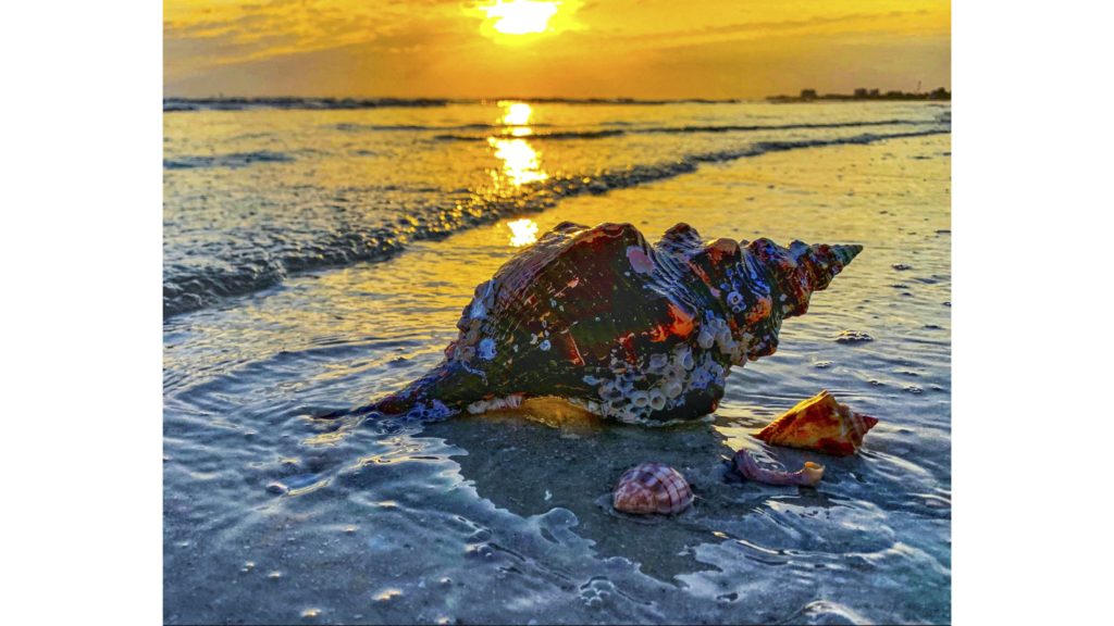 BEST PHOTO OF THE 2021 VIRTUAL SANIBEL SHELL SHOW goes to Lorna Littrell with her stunning winning Gastropod category photo entitled “Sunset Treasure” taken on Fort Myers Beach, Florida. Congratulations!