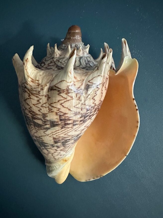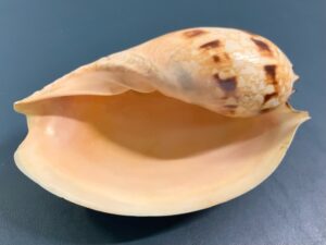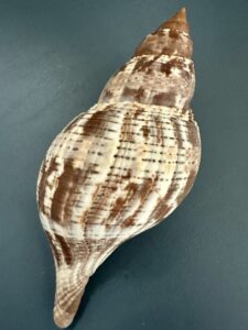 The shell is the sister species of the Pacific Triton Trumpet (Charonia variegata).  It’s a handsome, robust shell and measures 271 mm (10.66 in) with no data.