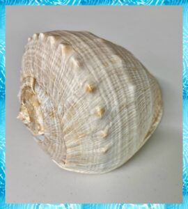 A member of the Helmet family, this species occurs off the southern African coast, the Red Sea. the Indian Ocean, and the Pacific. It’s a very heavy shell, which has horn-like knobs and a wide, flat base as an adult.