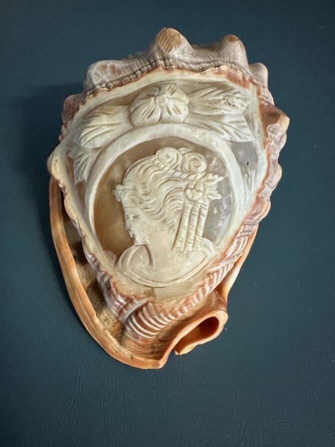 Found off the coast of southern Africa, Helmet mollusks make very thick shells with layers of varying colors. In the case of the Cameo Helmet, those colored layers of contrasting colors are masterfully carved to reveal shallow sculptured reliefs usually of female busts.