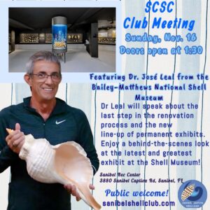 Our speaker for the November 16 meeting will be Jose’ H. Leal, Ph.D., the Science Director & Curator of the Bailey-Matthews National Shell Museum & Aquarium. Dr. Leal will provide an insider’s view of the newly refurbished Great Hall of Shells at the Museum. Completion of Phase 2 of the Great Hall was the last step in the conclusion of all physical renovations following the damage inflicted on the Museum by Hurricane Ian in September 2022. Dr Leal will comment on the topics included in the new line-up of permanent exhibits and discuss the complex workflow that led to their completion in October 2025. Come to the next meeting and enjoy a behind-the-scenes look at the latest and greatest exhibit at the Shell Museum!